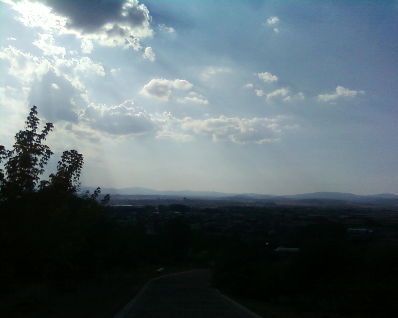 Hier bekomme ich ein sehr ueppiges und preiswertes Fruehstueck und siehe da. Da sind die Italienerinnen ja schon wieder. Na die kommen ja nicht so richtig vorran. Das Vergnuegen waehrt nur kurz, da ich mich feur den laengeren Weg ueber die Berge entscheide. Habe ich schon erwaehnt, dass ich jetzt viel Zeit habe. Von oben ist die Strasse, an der der kuerzere Weg langfuehrt immer wieder zu sehen. Nach einem steilen Aufstieg werde ich natuerlich belohnt fuer meine Muehen. Oben hoere ich A funk Odyssey von Jamiroquai. Da die meisten Pilger den anderen Weg gehen, ist es auch sehr schoen einsam.