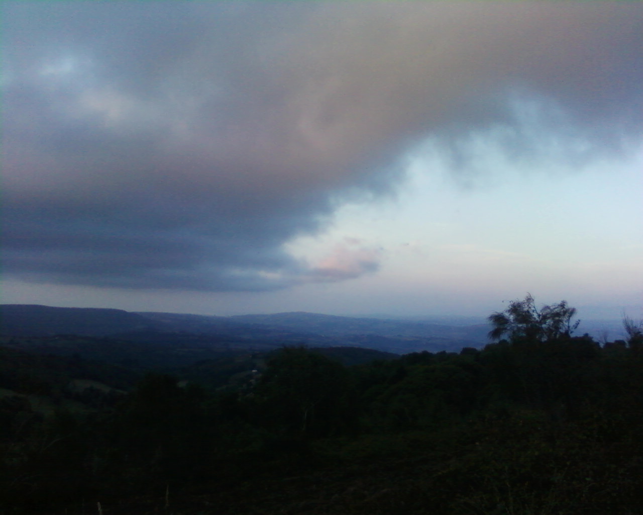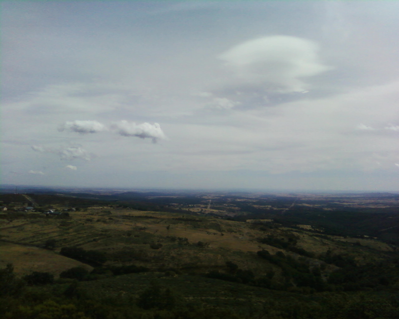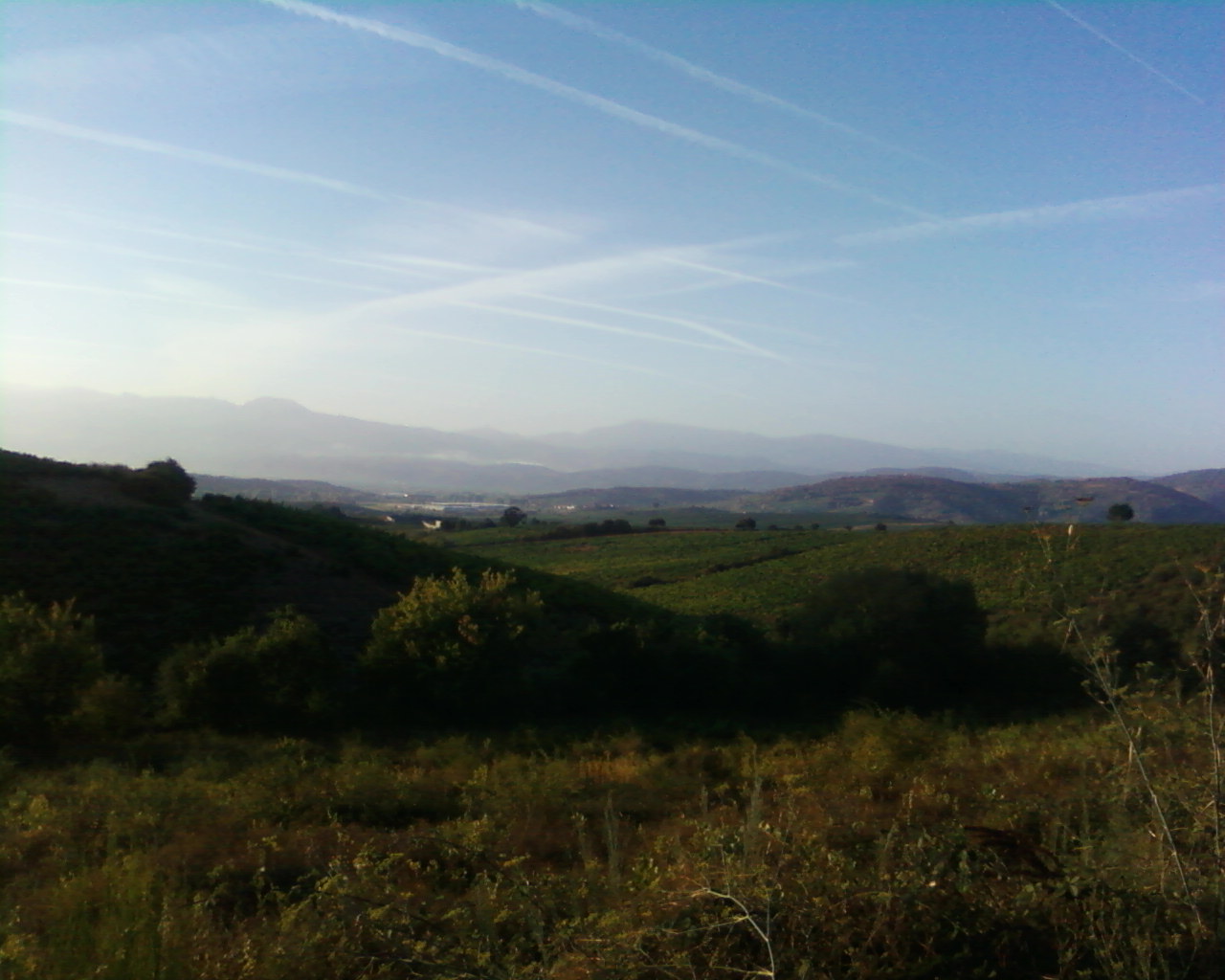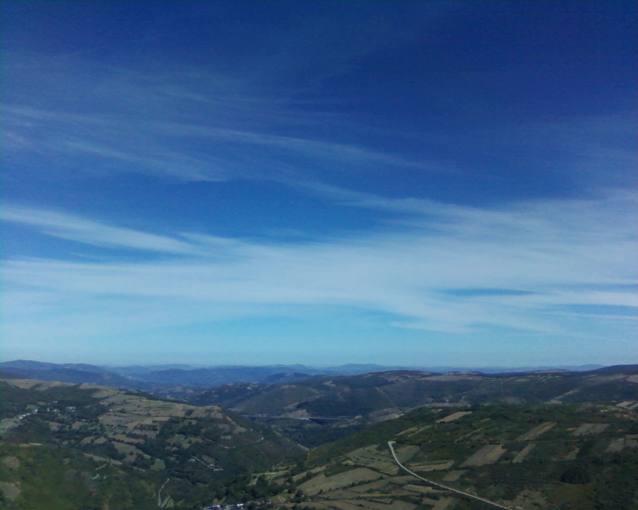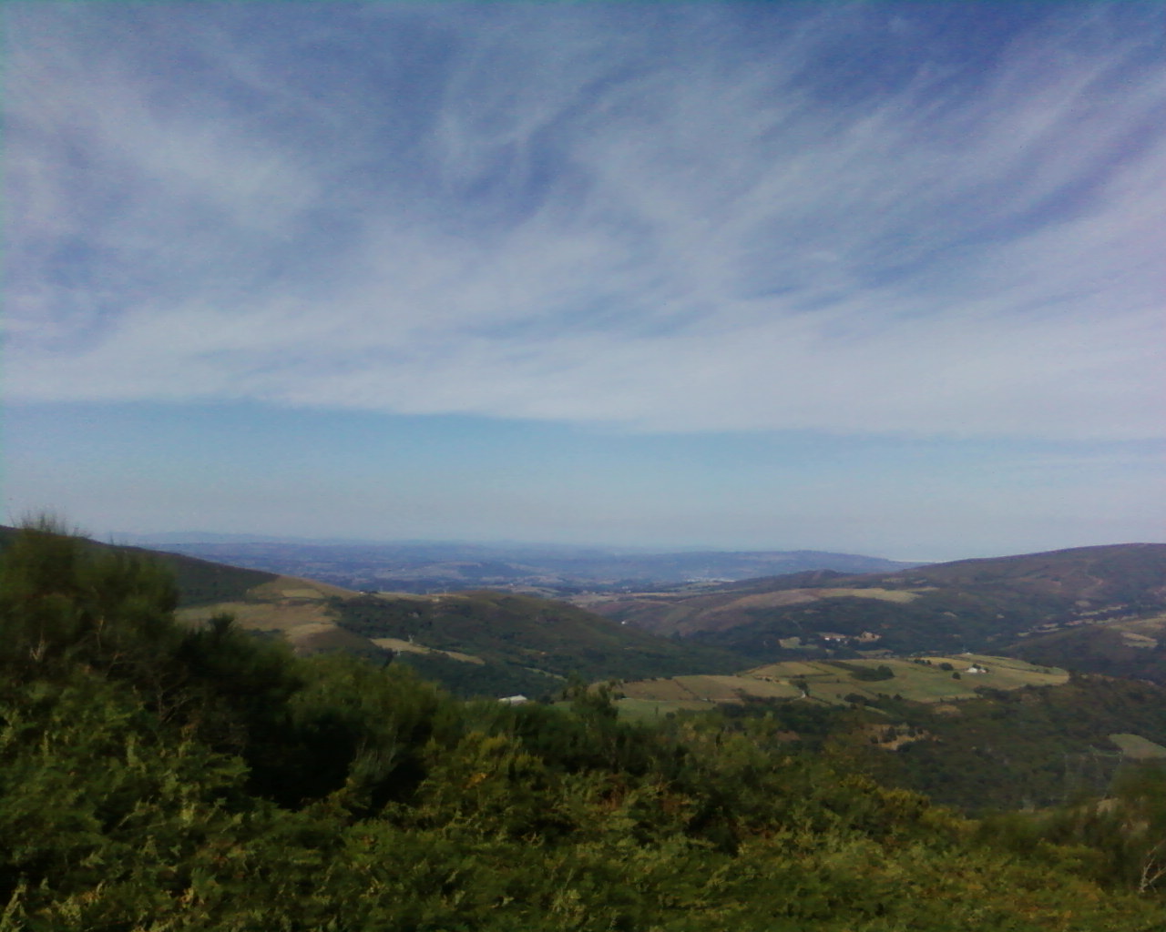 Auf dem zweiten Bild sind uebrigens Kreuze in den Zaun geflochten. Wieder ein typisches Pilgerkleinod. Mein kleiner Zeh nervt heut ein bisschen, was wahrscheinlich am Aufstieg liegt, aber dafuer werde ich mit einem grandiosem Blick zurueck belohnt. Man kann meinen Startpunkt garnicht mehr sehen, aber da hinten komme ich her.