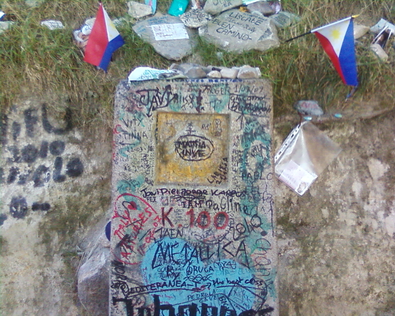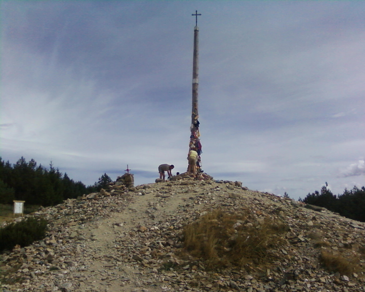 Hier ist einer der bekanntesten Punkte des Weges. Schon seit hunderten von Jahren legen die Pilger symbolisch einen Stein als Zeichen, dass sie ihre inneren Lasten loswerden ab. Das mache ich natuerlich auch.