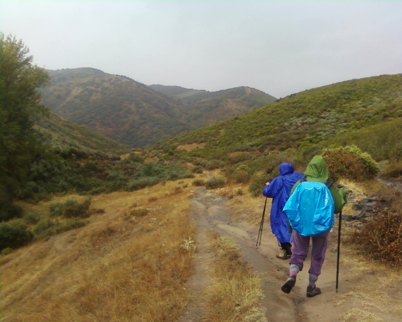 Dann kommt der Regen und es geht ueber Stock und Stein abwaerts. Immer in Richtung des Wasserflusses. Pilger sehen im Regen etwas albern aus.