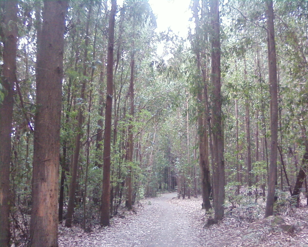 Jetzt wirds doch echt gemuetlich. Da die Strecke kurz ist, kann ich in aller Ruhe laufen. Endlich gehts auch mal durch die schon lange angekuendigten Eukalyptuswaelder.
